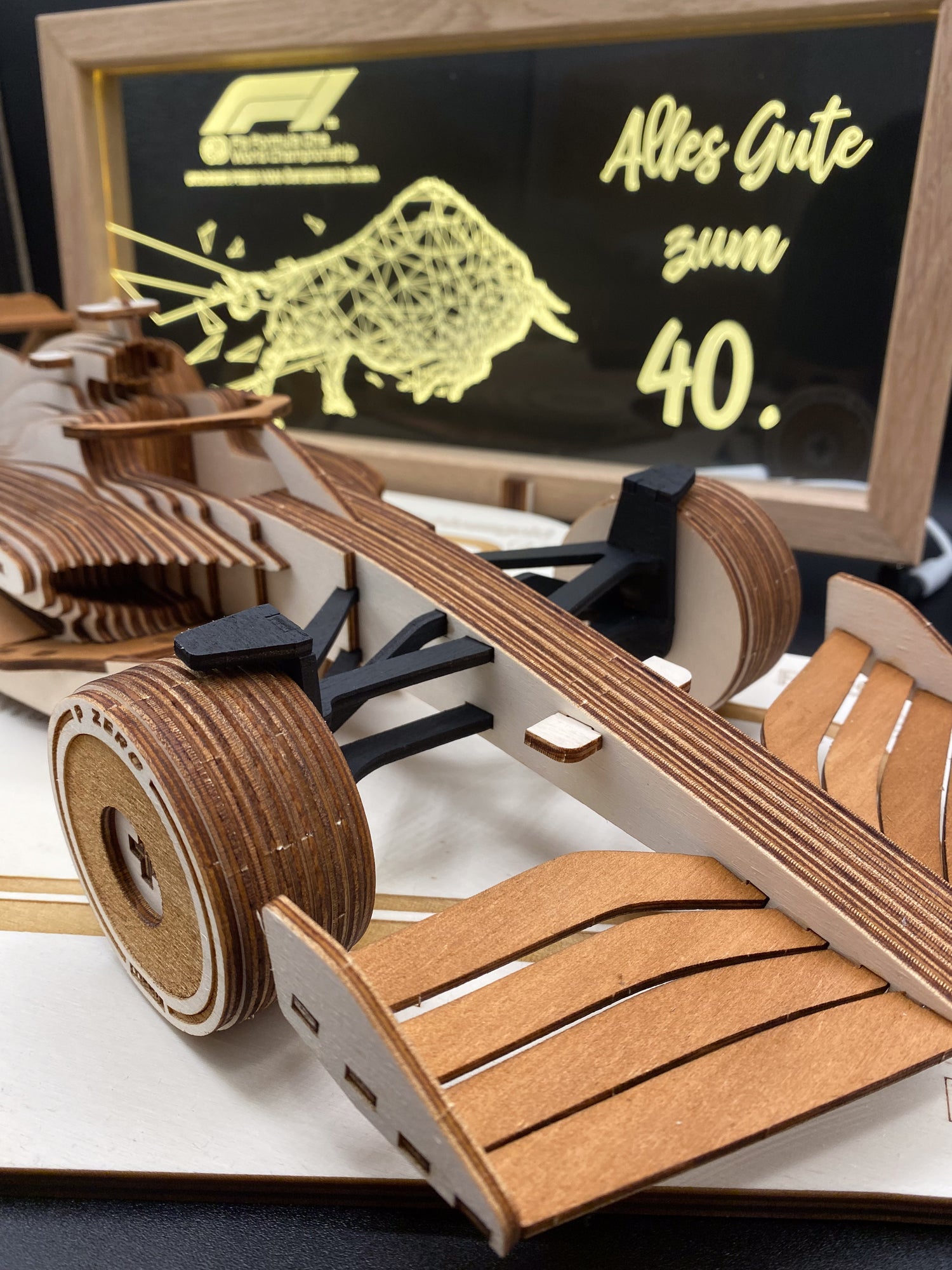 Du hast eine Idee, und möchtest etwas besonderes schenken? Gerne helfe ich Dir bei der Umsetzung - so wie hier : ein F1 Modell mit beleuchtetem Plexiglas-Bilderrahmen im Hintergrund.